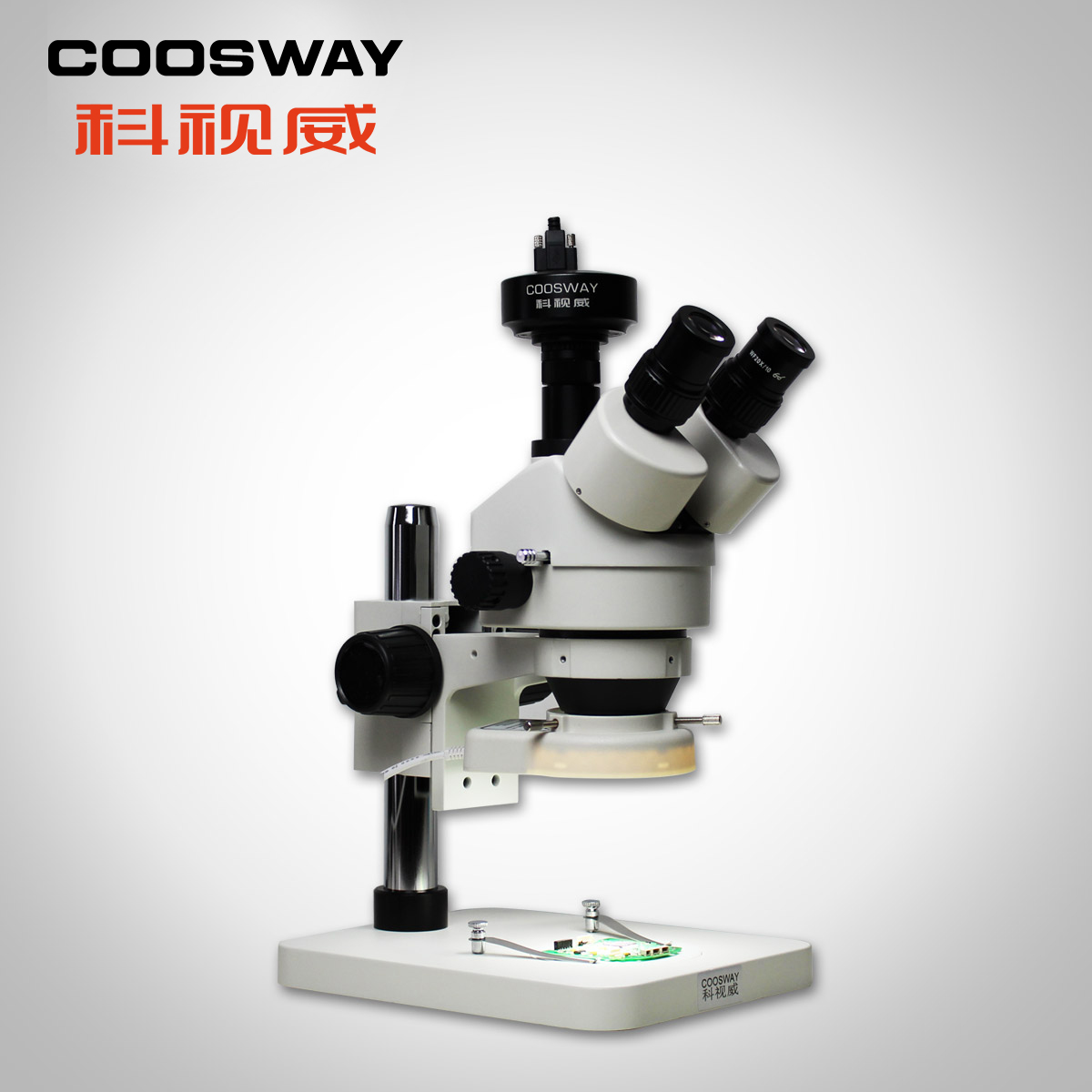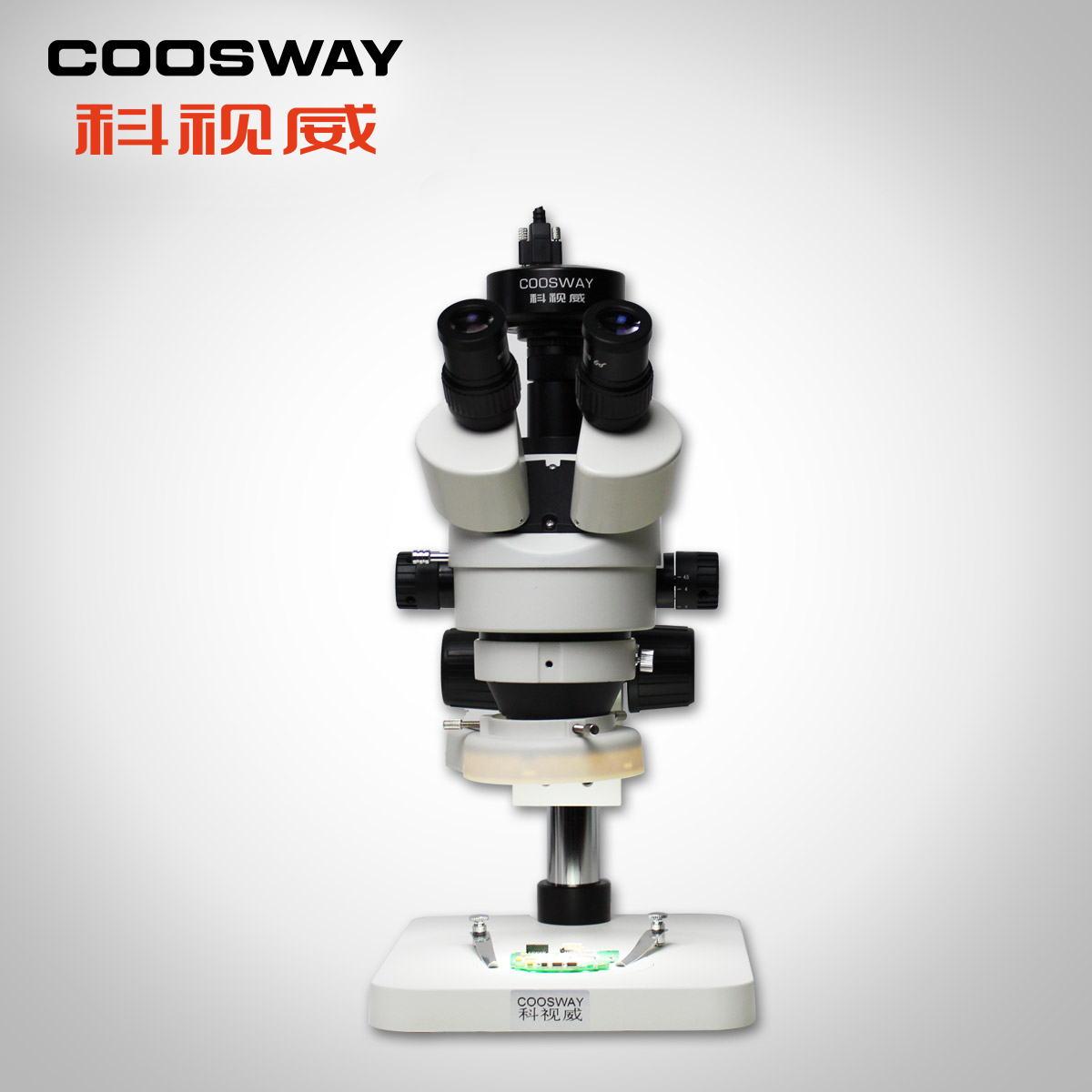 360°可轉(zhuǎn)鉸鏈式三目;三目為圖像輸出(chū)口;可連接各(gè)種顯(xiǎn)微鏡攝像頭